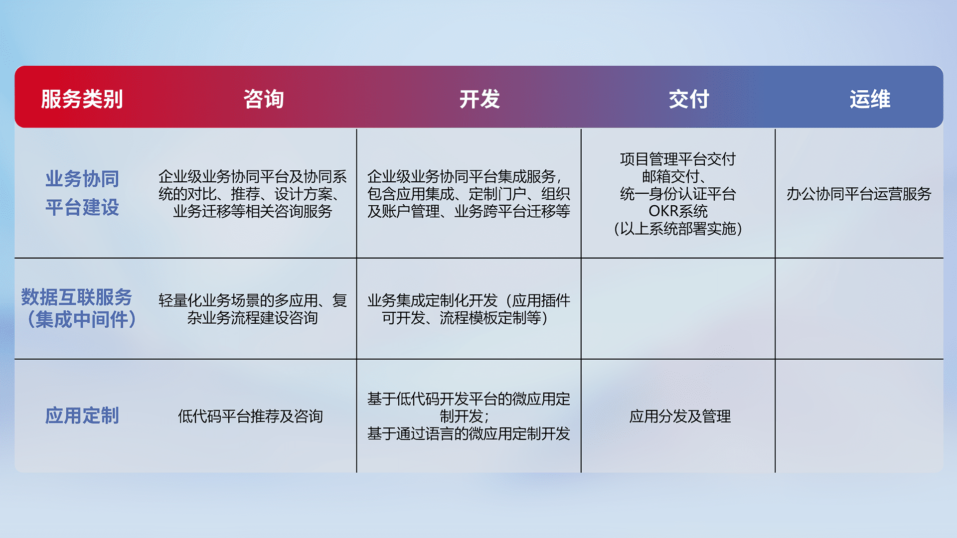 针对钉钉、、企微、、、、IDaas等平台级产品提供产品的规划、、、方案、、、交付、、、、定制化开发等服务,,,,实现如统一协同办公、、、、智能客户服务、、、混合会议管理、、、智能数据查询、、、、等业务场景,,实现数字化转型。。。。